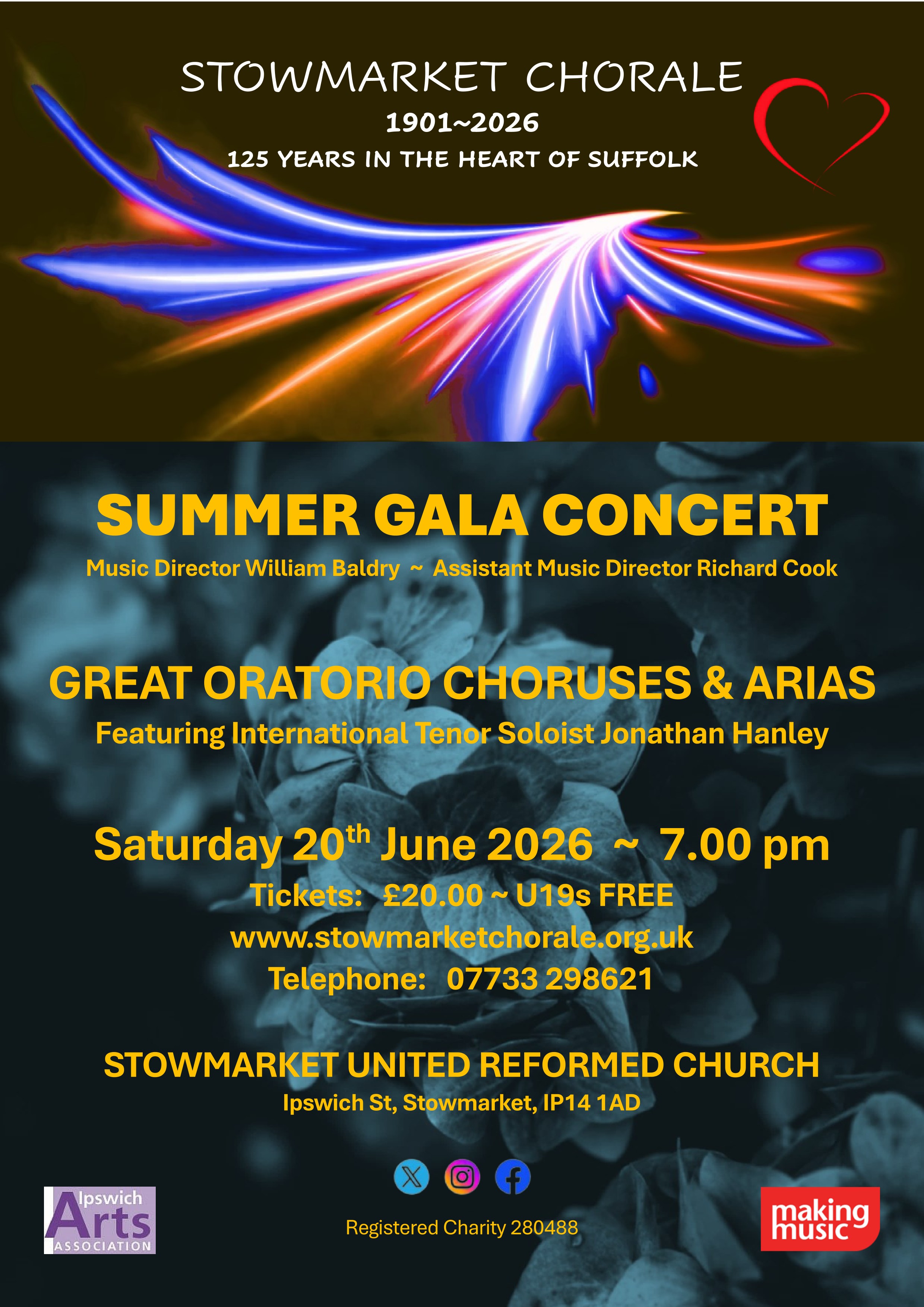 Stowmarket Chorale, ‘The Choir in the Heart of Suffolk’ is an ambitious, enthusiastic & friendly community choir, with a long history of promoting vocal music to a wide audience.